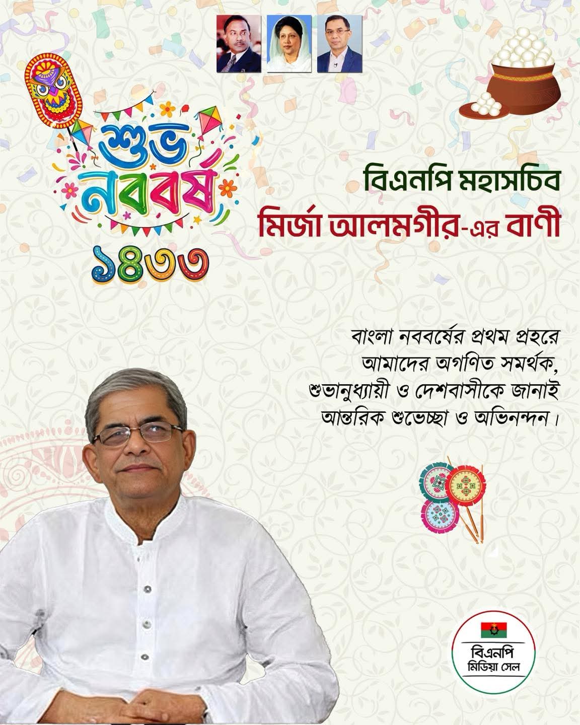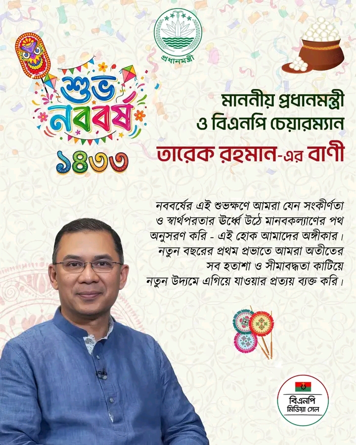 নিজস্ব প্রতিবেদকঃ প্রধানমন্ত্রী তারেক রহমান বলেছেন, পহেলা বৈশাখ আমাদের জাতিসত্তার ইতিহাস, সংস্কৃতি ও আত্মপরিচয়ের এক অনন্য প্রতীক। শতাব্দীর পর শতাব্দী ধরে এই দিনটি আমাদের জীবনে প্রতি বছর ফিরে আসে নতুনের আহ্বান নিয়ে। নতুন বছরের আগমনে পুরোনো জীর্ণতা ও গ্লানি পেছনে