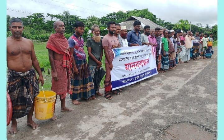 মানববন্ধনে বক্তব্য রাখেন, স্থানীয় ইউপি সদস্য এনায়েদ প্যাদা, সমাজ সেবক মো. শাহ-আলম, কৃষক পরিমল বাবু, হারুন প্যাদা, মোঃ ইসাহাক প্যাদা, আব্দুল কাদের, মোঃ সুলতান মিয়া প্রমুখ।