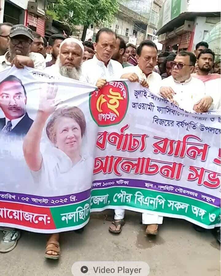 স্বৈরাচার পতনের প্রথম বার্ষিকী ঝালকাঠির নলছিটিতে বিজয় র্যালী ও আলোচনা সভার মধ্য দিয়ে পালিত হয়েছে। ৫ আগস্ট মঙ্গলবার জুলাই গণঅভ্যুত্থান উপলক্ষে সকাল ১০ টায় নলছিটি উপজেলা বিএনপি ও অঙ্গ সংগঠনের নেতৃবৃন্দ এবং ঝালকাঠি জেলা বিএনপির সদস্য সচিব অ্যাডভোকেট শাহাদাত হোসেন'র উপস্থিতিতে একটি র্যালি শহরের বিভিন্ন সড়ক প্রদিক্ষন শেষে নলছিটি পৌর ভবনের সামনে এসে শেষ হয়। এর পর আলোচনা সভায় বক্তব্য রাখেন জেলা বিএনপির সদস্য সচিব অ্যাডভোকেট শাহাদাত হোসেন, উপজেলা বিএনপির সাধারণ সম্পাদক মো.সেলিম গাজী, সাংগঠনিক সম্পাদক মাসুম শরীফ, পৌর বিএনপির সভাপতি মো. মজিবুর রহমান, সাধারণ সম্পাদক কাজী জাহাঙ্গীর হোসেন প্রমূখ।আলোচনা সভা শেষে জুলাই গন অভ্যুত্থানে শহীদদের রুহের মাগফেরাত কামনা ও আহতদের দ্রুত আরোগ্যের জন্য বিশেষ দোয়া মোনাজাত করা হয়। দোয়া মোনাজাত পরিচালনা করেন পৌর বিএনপির সাধারণ সম্পাদক কাজী জাহাঙ্গীর হোসেন।