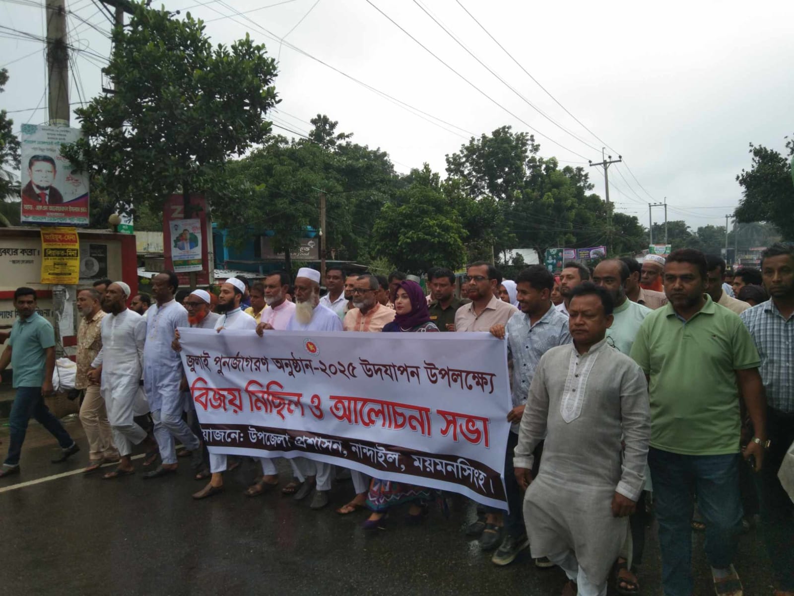 ময়মনসিংহের নান্দাইল উপজেলা প্রশাসনের আয়োজনে মঙ্গলবার (৫ আগস্ট) জুলাই পুনর্জাগরণ উদযাপন-২০২৫ উপলক্ষ্যে বিজয় মিছিল ও আলোচনা সভা অনুষ্ঠিত হয়েছে।