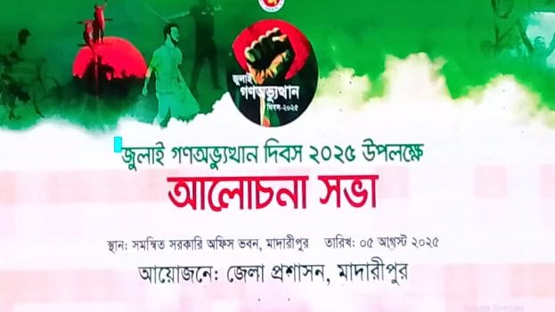মাদারীপুরে জুলাই গনঅভ্যুত্থান দিবস ২০২৫ উপলক্ষ্যে মাদারীপুর জেলা প্রশাসন, পুলিশ প্রশাসন, বিভিন্ন রাজনৈতিক ও সামাজিক সংগঠন, মানবাধিকার সংগঠন ও সুশীল সমাজের পক্ষ থেকে ব্যাপক কর্মসূচী নেয়া হয়। ৫ আগষ্ট মঙ্গলবার সকাল ৯ টায় বৈষম্যবিরোধী ছাত্র আন্দোলনে স্বৈরাচারী ফ্যাসিষ্টদের হাতে নিহত মাদারীপুরের সুচিয়ারভাঙ্গা গ্রামের তাওহীদ সান্ন্যামতের বাড়ীর কবরে পুষ্পমাল্য অর্পন ও তার আত্মার মাগফেরাত কামনা করেন জেলা প্রশাসক মোছাম্মৎ ইয়াসমিন আক্তার, মাদারীপুরের পুলিশ সুপার মোহাম্মদ নাঈম হাসান সহ প্রশাসনের অন্যান্য কর্মকর্তা। এসময় শহীদ তাওহীদ সান্ন্যামতের পিতা, মাতা ও বড় ভাই, মানবাধিকার সংস্থা, আসক ফাউন্ডেশনের জেলার সভাপতি সাংবাদিক ফায়েজুল শরীফ, জাতীয় সাংবাদিক সংস্থার সাধারণ সম্পাদক ইমদাদুল হক মিলন, এনটিভির সাংবাদিক এম,আর মর্তুজা ও সময় টিভির সাংবাদিক সঞ্জয় চক্রবর্তী অভিজিৎ সহ উক্ত এলাকার গন্যমান্য ব্যক্তিবর্গ উপস্থিত ছিলেন।