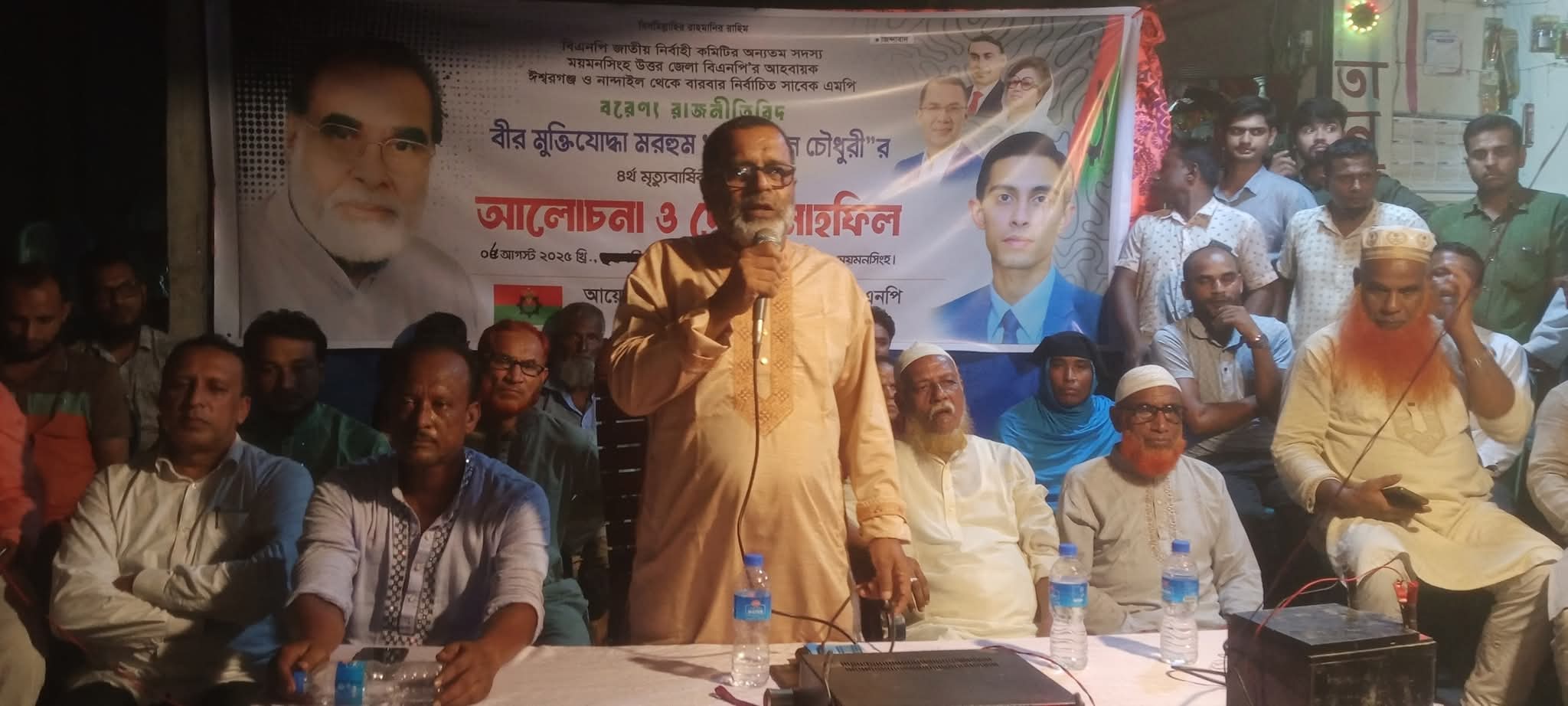 ময়মনসিংহের নান্দাইলে চন্ডীপাশা ইউনিয়ন বিএনপি ও অঙ্গ সহযোগী সংগঠনের আয়োজনে বাংলাদেশ জাতীয়তাবাদী দল বিএনপির জাতীয় নির্বাহী কমিটির সাবেক সদস্য, ময়মনসিংহ উত্তর জেলা বিএনপির সাবেক আহবায়ক, ৪বারের সাবেক সংসদ সদস্য বরেণ্য রাজনীতিবিদ বীরমুক্তিযোদ্ধা খুররম খান চৌধুরীর ৪র্থ মৃত্যু বার্ষিকী উপলক্ষে আলোচনা সভা ও দোয়া মাহফিল অনুষ্ঠিত হয়েছে। বুধবার (৬ই আগস্ট)বারুইগ্রাম চৌরাস্তা বাজারে উক্ত দোয়া মাহফিল অনুষ্ঠিত হয়,এ উপলক্ষে আয়োজিত দোয়া মাহফিলে চন্ডীপাশা ইউনিয়ন বিএনপি,র সাবেক সভাপতি আবুল হাসেমে ভূঁইয়ার সভাপতিত্বে ও উপজেলা যুবদল নেতা মাহমুদুল হাসান আরিফ ও শাহজাহান কবিরের যৌথ সঞ্চালনায় প্রধান অতিথি হিসেবে মরহুমের কর্মবহুল জীবনী নিয়ে স্মৃতিচারণ করেন উপজেলা বিএনপির সাবেক সাধারণ সম্পাদক ও ময়মনসিংহ উত্তর জেলা বিএনপির সদস্য আবুল কালাম আজাদ, এসময় বিশেষ অতিথি হিসবেনে স্মৃতিচারণ করেন ময়মনসিংহ উত্তর জেলা বিএনপির সদস্য একেএম মাসুম খান, উপজেলা বিএনপি,র সাবেক সহ সভাপতি আব্দুল মান্নান মাস্টার, উপজেলা বিএনপি নেতা জিয়া উদ্দিন শাহিন, পৌরসভা বিএনপি,র সাবেক সাংগঠনিক সম্পাদক কামরুজ্জামান সাজু, সাবেক প্রচার ও প্রকাশনা সম্পাদক কামরুজ্জামান খোকন, উপজেলা মহিলাদল নেত্রী তাহমিনা আক্তার রিপা, উপজেলা যুবদল নেতা জহিরুল হক জহির, আবু হুরাইরা,মোবারক হোসেন উজ্জ্বল,মোজাম্মেল হক সুমন সহ প্রমুখ।