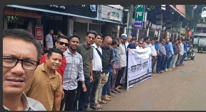 গাজীপুরে দৈনিক প্রতিদিনের কাগজ–এর স্টাফ রিপোর্টার আসাদুজ্জামান তুহিনকে নৃশংসভাবে কুপিয়ে হত্যার প্রতিবাদে এবং সাংবাদিকদের পেশাগত নিরাপত্তা নিশ্চিতের দাবিতে বান্দরবানে মানববন্ধন অনুষ্ঠিত হয়েছে।