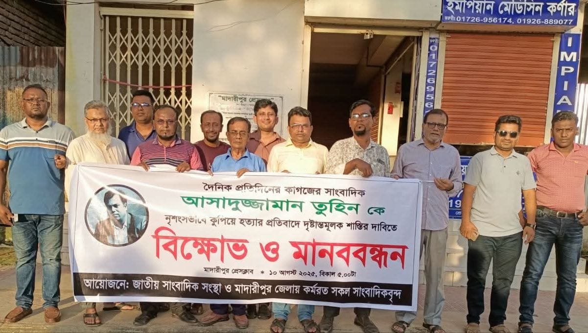 দৈনিক প্রতিদিনের কাগজ পত্রিকার গাজীপুর জেলা প্রতিনিধি সাংবাদিক আসাদুজ্জামান তুহিনকে কুপিয়ে ও জবাই করে নৃশংসভাবে হত্যার প্রতিবাদে মাদারীপুরে বিক্ষোভ ও মানববন্ধন অনুষ্ঠিত হয়েছে। রবিবার (১০ আগষ্ট) বিকেলে মাদারীপুর প্রেসক্লাবের সামনে জাতীয় সাংবাদিক সংস্থা মাদারীপুর জেলা শাখা ও সর্বস্তরের সাংবাদিকদের উদ্যোগে এ কর্মসূচি পালন করা হয়।