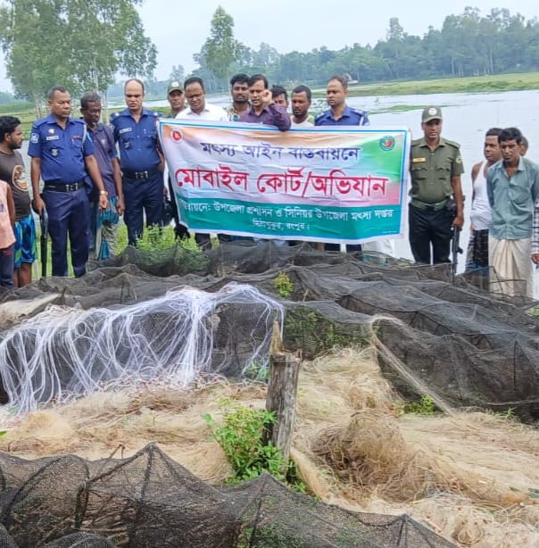 মিঠাপুকুরে চায়না দোয়ারী এবং কারেন্ট জালের বিরুদ্ধে কঠোর পদক্ষেপ নিয়েছে উপজেলা প্রশাসন। আজ বৃহস্পতিবার ১৪ আগস্ট বৃহস্পতিবার উপজেলার ভাংনী ইউনিয়স্থ ভেতর ভাংনী ও দমদমা ঘাগট নদীতে সকাল ৬টায় জলাশয়ে একটি বিশেষ মোবাইল কোর্ট পরিচালনা করা হয়। এই অভিযানে নেতৃত্ব দেন উপজেলা নির্বাহী অফিসার মোঃ জিল্লুর রহমান। তিনি মৎস্য হ্যাচারী আইনে ২ হাজার টাকা জরিমান করেন। ৫শ মিটার কারেন্টজাল ও ১ হাজার ৫শ মিটার চায়না দুয়ারী জাল পুড়িয়ে ধংস করেন। এ সময় মিঠাপুকুর সিনিয়র উপজেলা মৎস্য কর্মকর্তা কৃষিবিদ মোঃ হাকিবুর রহমান, সহকারী মৎস্য কর্মকর্তা মনজুরুল হক উপস্থিত ছিলেন।