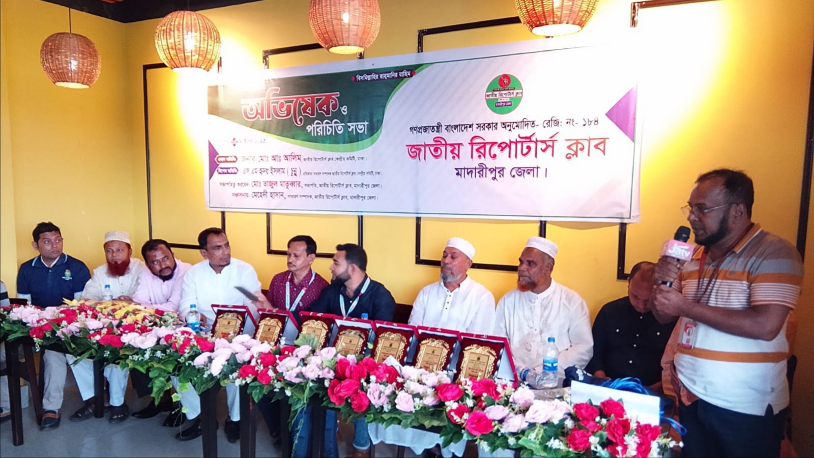 মাদারীপুরে অনুষ্ঠিত হলো জাতীয় রিপোর্টার্স ক্লাব (রেজিঃ নং-১৮৪) মাদারীপুর জেলা শাখার নবনির্বাচিত কমিটির অভিষেক ও পরিচিতি সভা। শনিবার (৪ অক্টোবর) বেলা ১২ টায় শহরের শকুনী লেকের পাড়ে স্বপ্নচূড়া রেষ্টুরেন্টের রুফটপে পবিত্র কুরআন তেলাওয়াতের মধ্য দিয়ে উক্ত সংস্থার জেলা শাখার সভাপতি সাংবাদিক মোঃ তাজুল মাতুব্বারের সভাপতিত্বে ও সাধারণ সম্পাদক মেহেদী হাসানের সার্বিক তত্বাবধান এবং দৈনিক আলোকিত নিউজের ষ্টাফ রিপোর্টার ও জাতীয় সাংবাদিক সংস্থার কেন্দ্রীয় সাংগঠনিক ও মাদারীপুর জেলার সভাপতি মোঃ ফায়েজুল শরীফের সঞ্চালনায় প্রধান অতিথি হিসাবে উপস্থিত থেকে বক্তব্য রাখেন উক্ত সংস্থার কেন্দ্রীয় কমিটির সভাপতি মোঃ আঃ আলীম, সাধারণ সম্পাদক এস,এম হৃদয় ইসলাম চুন্নু, আমন্ত্রিত বিশেষ অতিথি হিসাবে উপস্থিত থেকে বক্তব্য রাখেন মাদারীপুর জেলা বিএনপি’র সদস্য সচিব বর্ষিয়ান নেতা জাহান্দার আলী জাহান, জেলা জামায়াতের আমীর মাওলানা মোঃ মোখলেছুর রহমান, জজকোর্ট মাদারীপুর এর জিপি এ্যাডভোকেট গুলজার আহম্মেদ চিশতী (মস্তফা), বিটিভির সাবেক সিনিয়র সাংবাদিক ও জাতীয় সাংবাদিক সংস্থা মাদারীপুর জেলার প্রধান উপদেষ্টা মোঃ মাহাবুর রহমান বাদল, জেলা যুবদলের সভাপতি মোঃ ফারুক বেপারী, জেলা মৈত্রী মিডিয়া সেন্টারের সাধারণ সম্পাদক ও জাতীয় সাংবাদিক সংস্থার উপদেষ্টা এস,এম আরাফাত হাসান, জেলা জাতীয় রিপোর্টার্স ক্লাবের উপদেষ্টা ব্যবসায়ী মোস্তাক আহম্মেদ, সহ-সভাপতি আনোয়ার হাওলাদার সহ উক্ত সংগঠনের অন্যান্য নেতৃবৃন্দ। অনুষ্ঠানের শুরুতেই উক্ত সংস্থার কেন্দ্রীয় সভাপতি ও প্রধান অতিথি মোঃ আঃ আলীম নবগঠিত মাদারীপুর জেলার কার্যনির্বাহী কমিটির সভাপতি তাজুল মাতুব্বার, সাধারণ সম্পাদক মেহেদী হাসান সহ অন্যান্য সকল সাংবাদিক নেতৃবৃন্দকে ফুলের শুভেচ্ছা বরণে পরিচয় করিয়ে দিয়ে বেলেন, জাতীয় রিপোর্টার্স ক্লাব মাদারীপুর জেলা শাখা মাদারীপুরের সর্বস্তরের সাংবাদিক সমন্বয়ে গুণীজন রাজনীতিবিদ, সমাজকর্মী, মানবাধিকার কর্মী, সুশীলসমাজ, সচেতন নাগরিকদের নিয়ে অত্যন্ত একটি সুন্দর আয়োজন করেছে, যা প্রশংসার দাবী রাখে। তিনি সততা, নিষ্ঠা, পেশাগত দক্ষতা, মেধা,সাহস ও বস্তুনিষ্ঠ সংবাদ পরিবেশনের মাধ্যমে মাদারীপুরবাসি সহ দেশ ও জাতিকে এগিয়ে নিতে কাজ করার নির্দেশনা দেন।