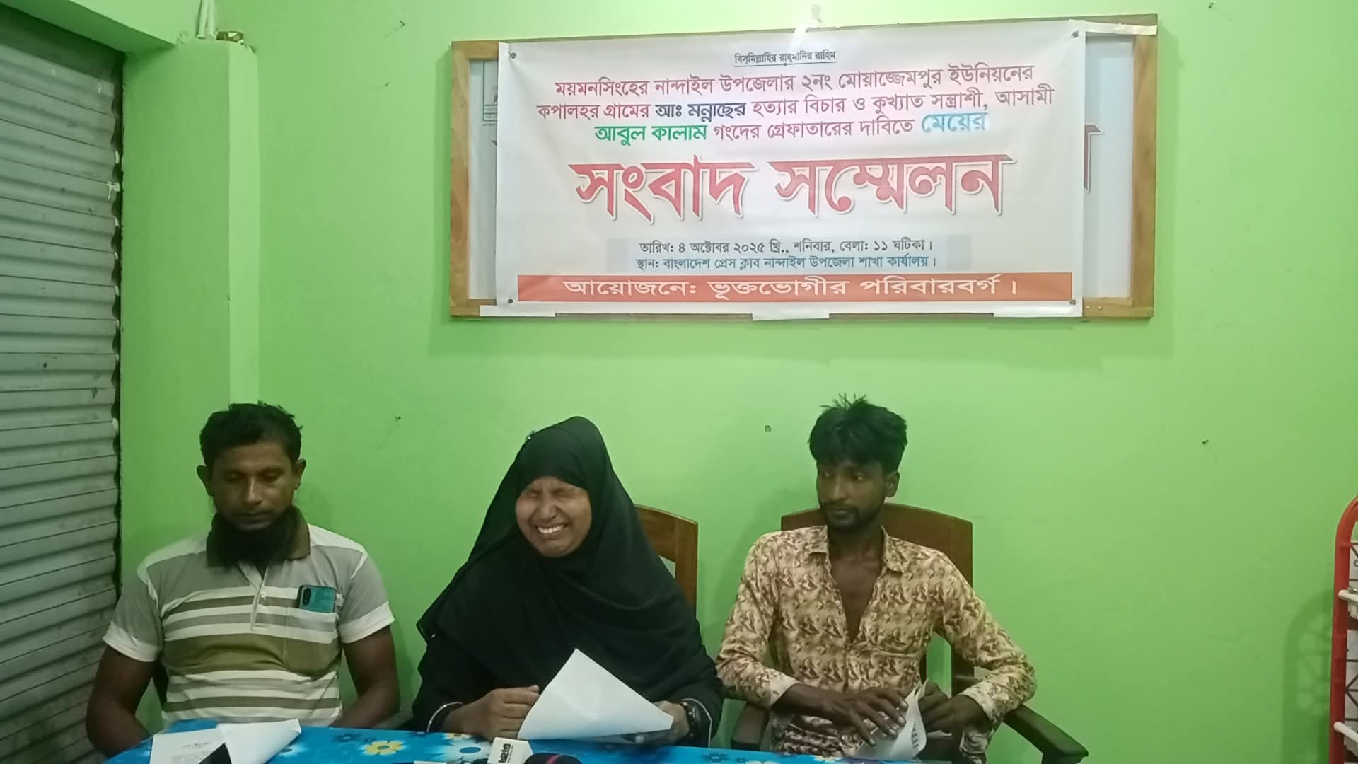 ময়মনসিংহের নান্দাইল উপজেলার ২নং মোয়াজ্জেমপুর ইউনিয়নের কপালহর গ্রামের আ. মন্নাছ হত্যা মামলার আসামীদের দ্রুত গ্রেফতার ও ন্যায়বিচারের দাবিতে সংবাদ সম্মেলন অনুষ্ঠিত হয়েছে। শনিবার (৪ অক্টোবর) সকাল ১১টায় বাংলাদেশ প্রেস ক্লাব নান্দাইল উপজেলা শাখা কার্যালয়ে নিহতের মেয়ে মোছা. মাহমুদা আক্তার এই সংবাদ সম্মেলনের আয়োজন করেন।