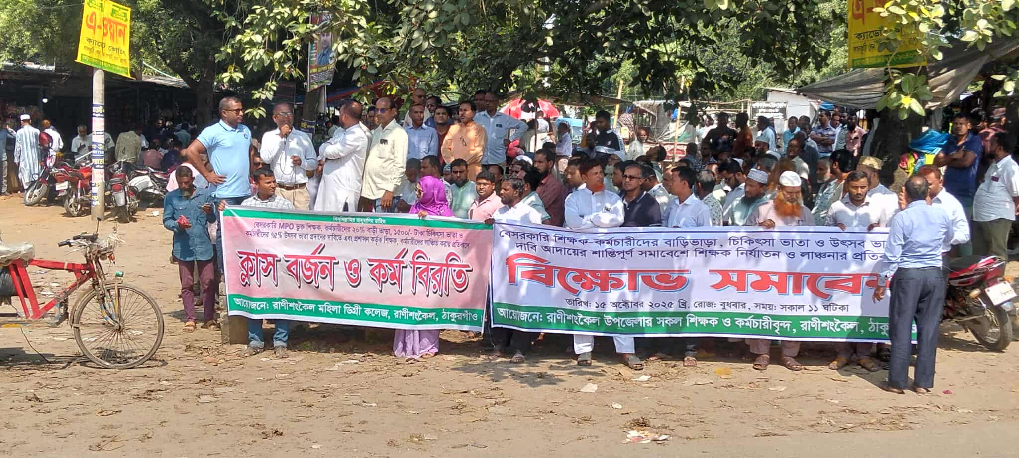 সারা দেশের ন্যায় ঠাকুরগাঁও জেলার রাণীশংকৈল উপজেলায় তিন দফা দাবিতে মানববন্ধন ও বিক্ষোভ সমাবেশ করেছে বেসরকারি শিক্ষক-কর্মচারীগণ।