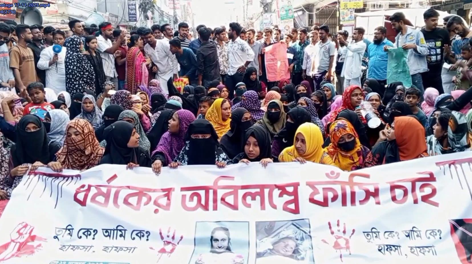 সেখানে নিহত শিশু শিক্ষার্থী হাফসার স্বজন ও গ্রামবাসীরা বক্তব্য দেন। সংক্ষিপ্ত সমাবেশ শেষে মিছিল নিয়ে শহরের প্রধান সড়ক আব্দুল হামিদ রোড় অবরোধ করে বিক্ষোভ করে তারা। প্রায় এক ঘন্টা অবরোধ শেষে পুলিশ প্রশাসনের পক্ষে আগামী ২৪ ঘন্টার মধ্যে অভিযুক্তদের গ্রেপ্তারের আশ্বাস দিলে অবরোধ তুলে নেয় বিক্ষোভকারীরা।উল্লেখ্য,গত শনিবার রাতে পাবনা পৌর সদরের উত্তর শালগাড়িয়া সরদারপাড়া এলাকার ৯ বছরের শিশু শিক্ষার্থী হাফসার মরদেহ তার নানা বাড়ির পাশের একটি বাগান থেকে উদ্ধার করা হয়। নিহত হাফসা উত্তর শালগাড়িয়া সরদারপাড়ার নানা মল্লিক সরদারের বাড়িতে থাকতো এবং স্থানীয় একটি কিন্ডারগার্টেন স্কুলে দ্বীতিয় শ্রেণির ছাত্রী ছিল। ঘটনার পর পুলিশ রমজান ও সাব্বির নামের দুই যুবককে আটক করে।