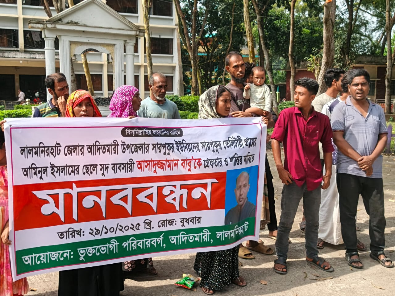 লালমনিরহাট প্রতিনিধিঃ লালমনিরহাটের আদিতমারী উপজেলার আসাদুজ্জামান বাবু নামে এক দাদন (সুদ) ব্যবসায়ীকে গ্রেপ্তার ও শাস্তির দাবিতে মানববন্ধন করেছে এলাকাবাসী। বুধবার (২৯ অক্টোবর) দুপুর ১২ টায় আদিতমারী উপজেলা নির্বাহী অফিসারের কার্যালয়ের